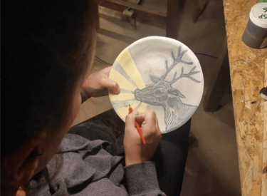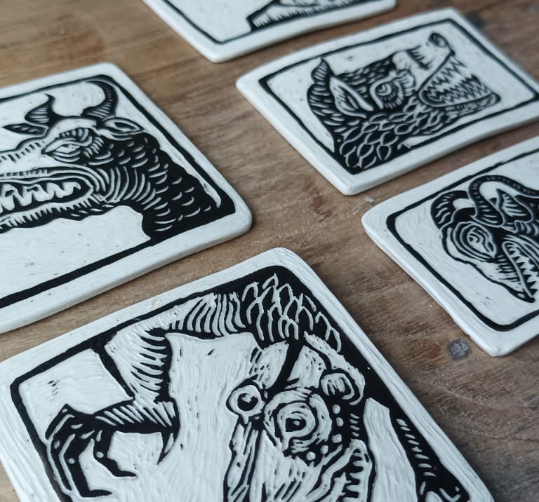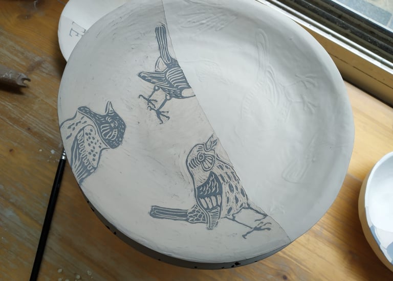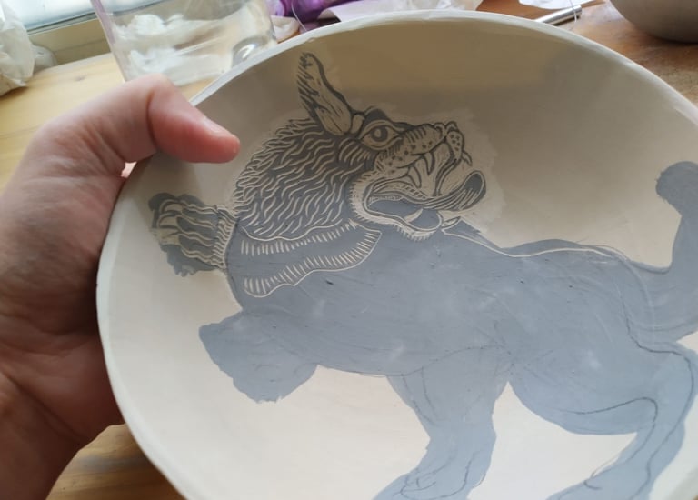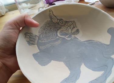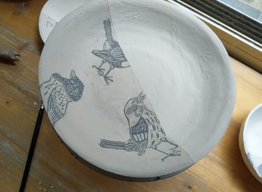 Pour illustrer mes pièces en grès, j'utilise une technique italienne s’appelant le "Sgraffito"